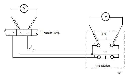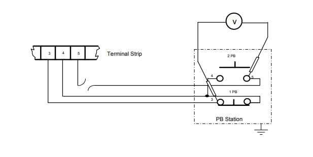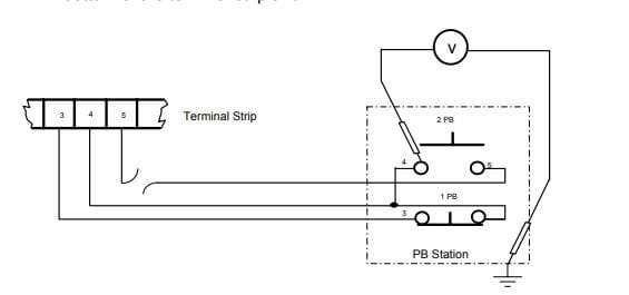 Step 19. You know that wire #4 or wire #5 is open between the bottom of the terminal strip and the pushbutton. There are two different methods to eliminate the possibilities. First method: check the voltage across the terminal with wire #4 to the ground terminal as a reference. • If the voltage is present, then wire #4 is good, and wire #5 must be open between the bottom of the terminal strip and the 2PB. • If the voltage is not present, then wire #4 must be open between the bottom of the terminal strip and the 2PB.